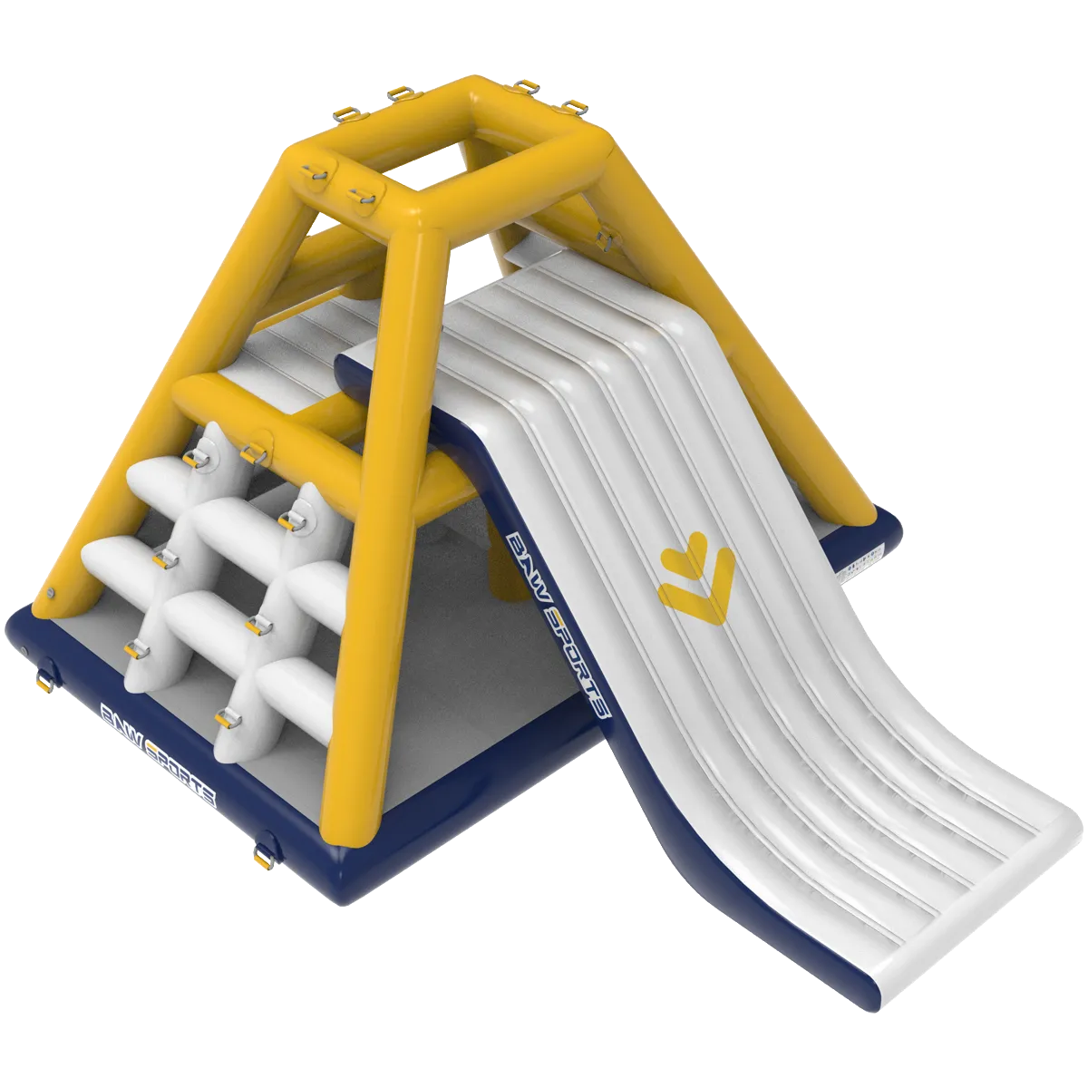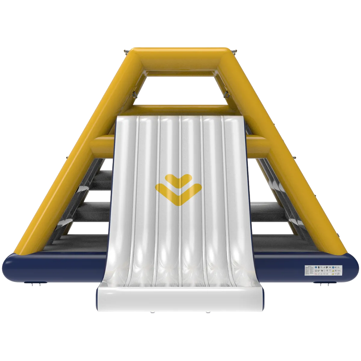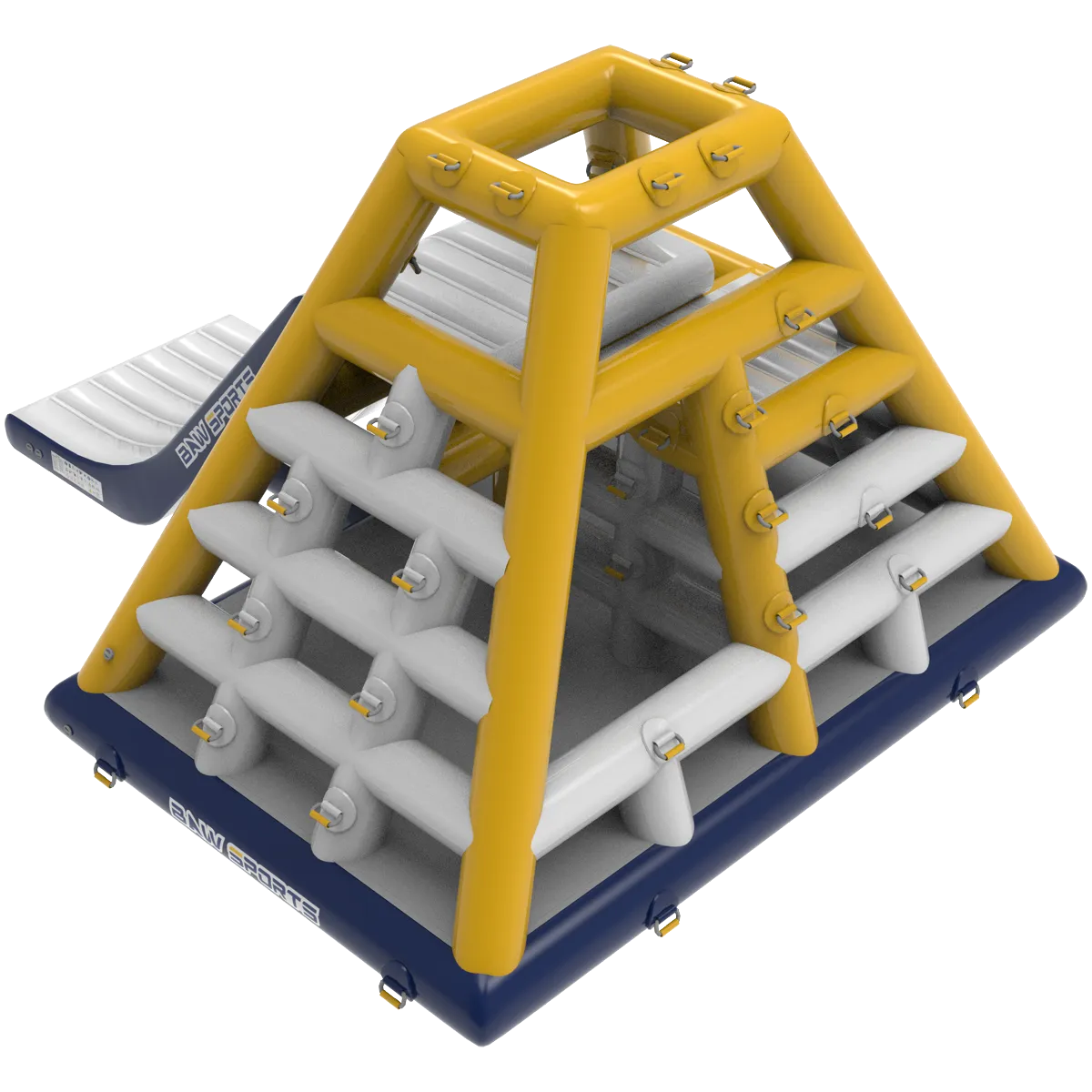 Apex XL un ostacolo a forma di piramide che può essere scalato su 3 lati, mentre il quarto è un grande scivolo che si tuffa in acqua da oltre 2 metri di altezza per emozioni forti.